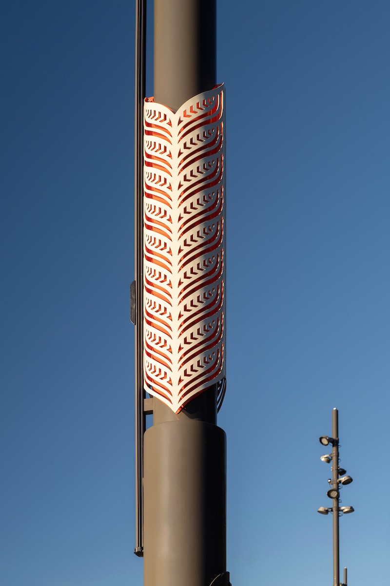 A co‑design process with Mana Whenua ensured the installation honours the site’s narratives. Cultural sleeves by designer Len Hetet, fabricated by Human Dynamo Workshop, give the smart poles a visible identity—art meeting infrastructure in the heart of the city.