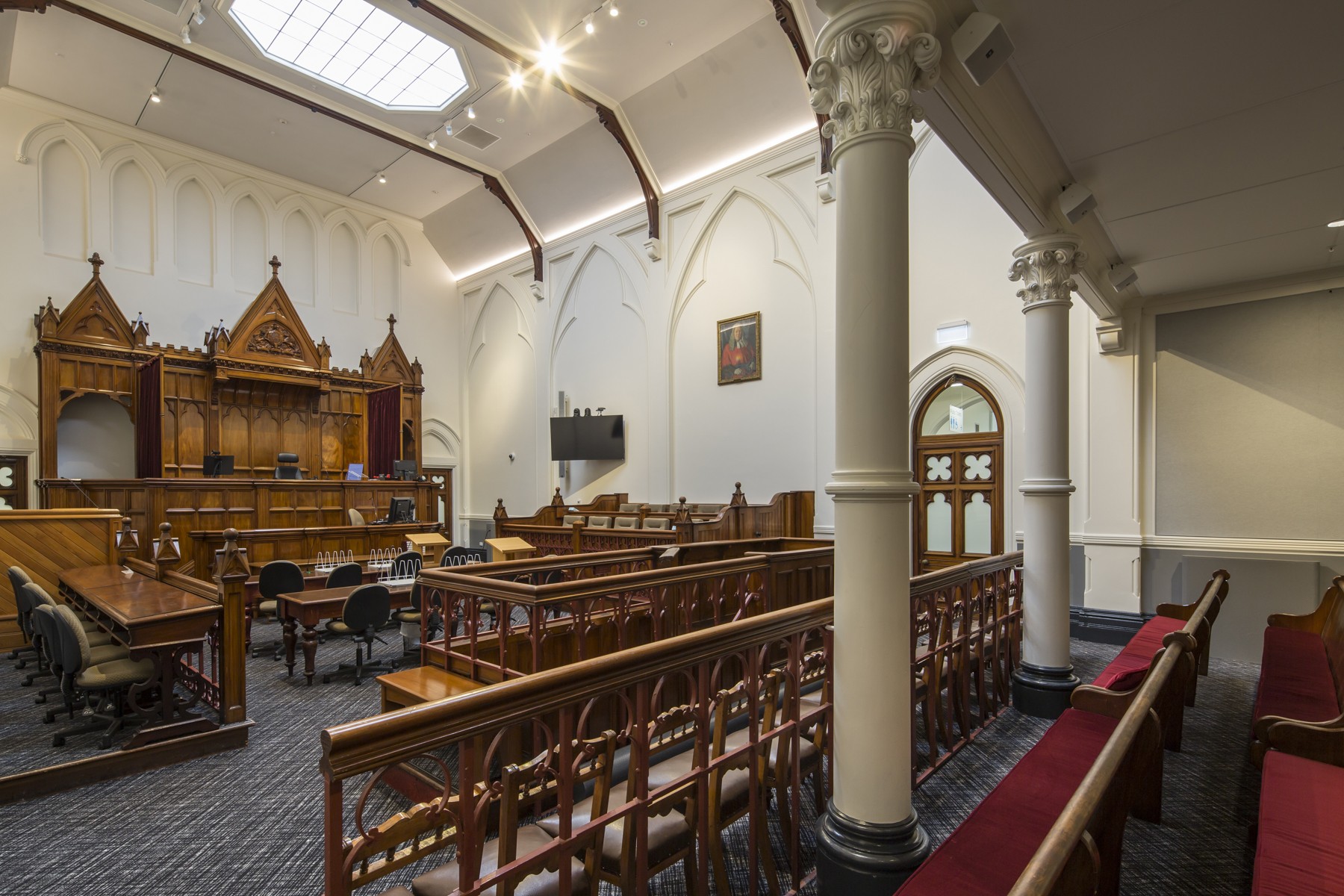 Internally, the project involved significant spatial reconfiguration to improve support spaces alongside modernisation of the courtrooms. These upgrades featured specialist acoustic ceilings, lighting enhancements, and improved AV and data infrastructure. Original courtroom joinery was delicately removed, catalogued and stored, and carefully reinstated following the structural strengthening.