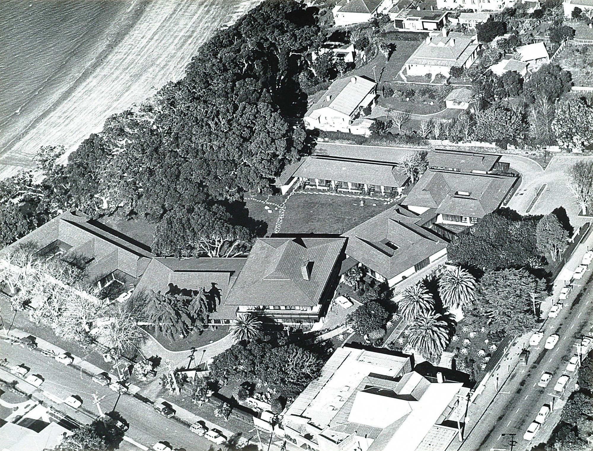 Nestled among landscaped grounds dominated by large Pōhutukawa trees, the design featured a village-like arrangement, with pavilion-style structures surrounding a central two-storey reception building. This layout fostered a sense of tranquillity while providing seamless access to the adjacent beachfront. The reception building housed two lounges, a convention room, a dining room, and a coffee lounge, blending innovative residential architecture with hospitality-focused architecture solutions.