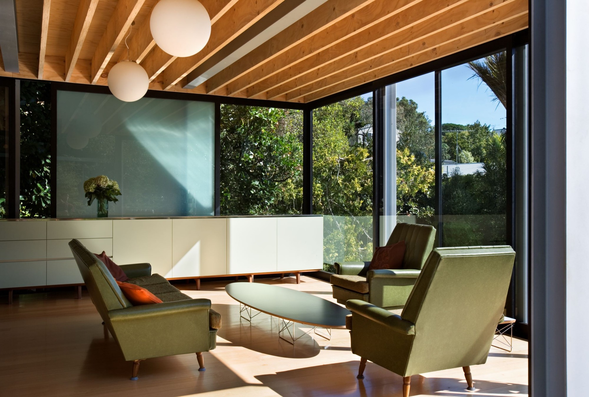 While this glass house references Mies van der Rohe’s work, the assumption that this is a mimetic glass box is subtly overturned with each and every section of the cladding system sliding - allowing for endless possibilities for spatial interaction with the outdoors and cross ventilation.